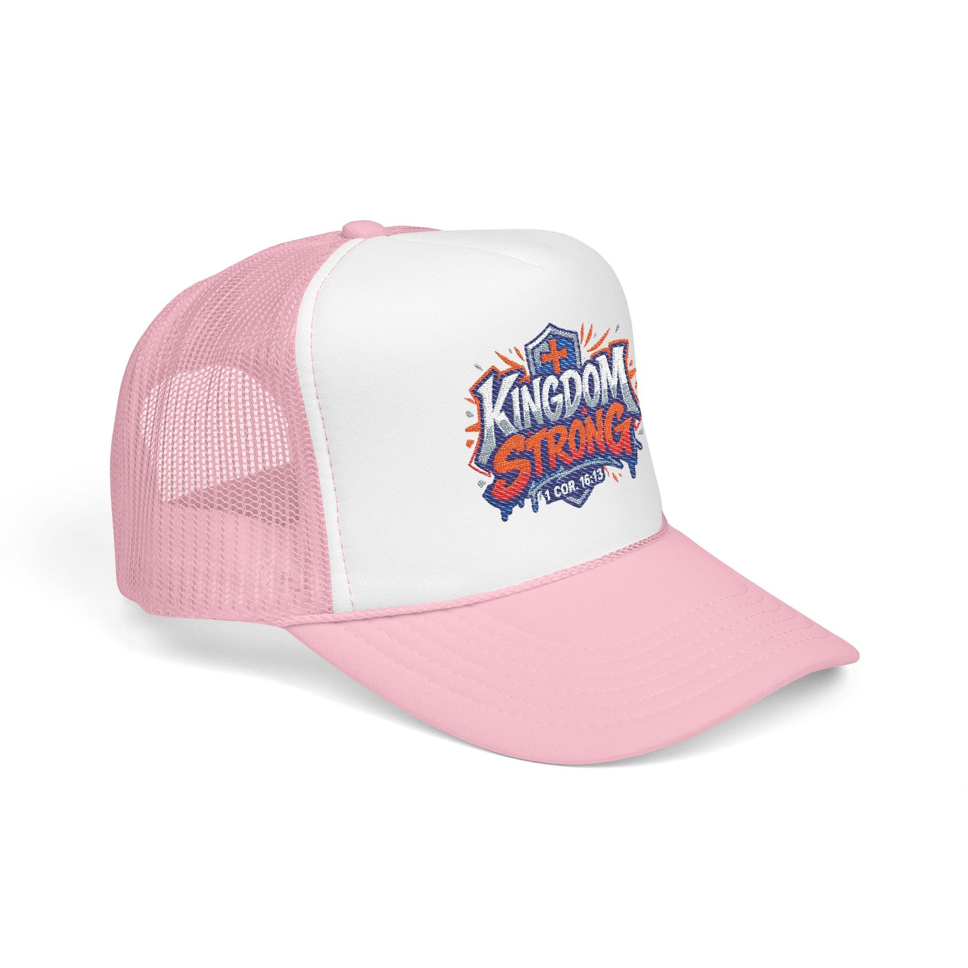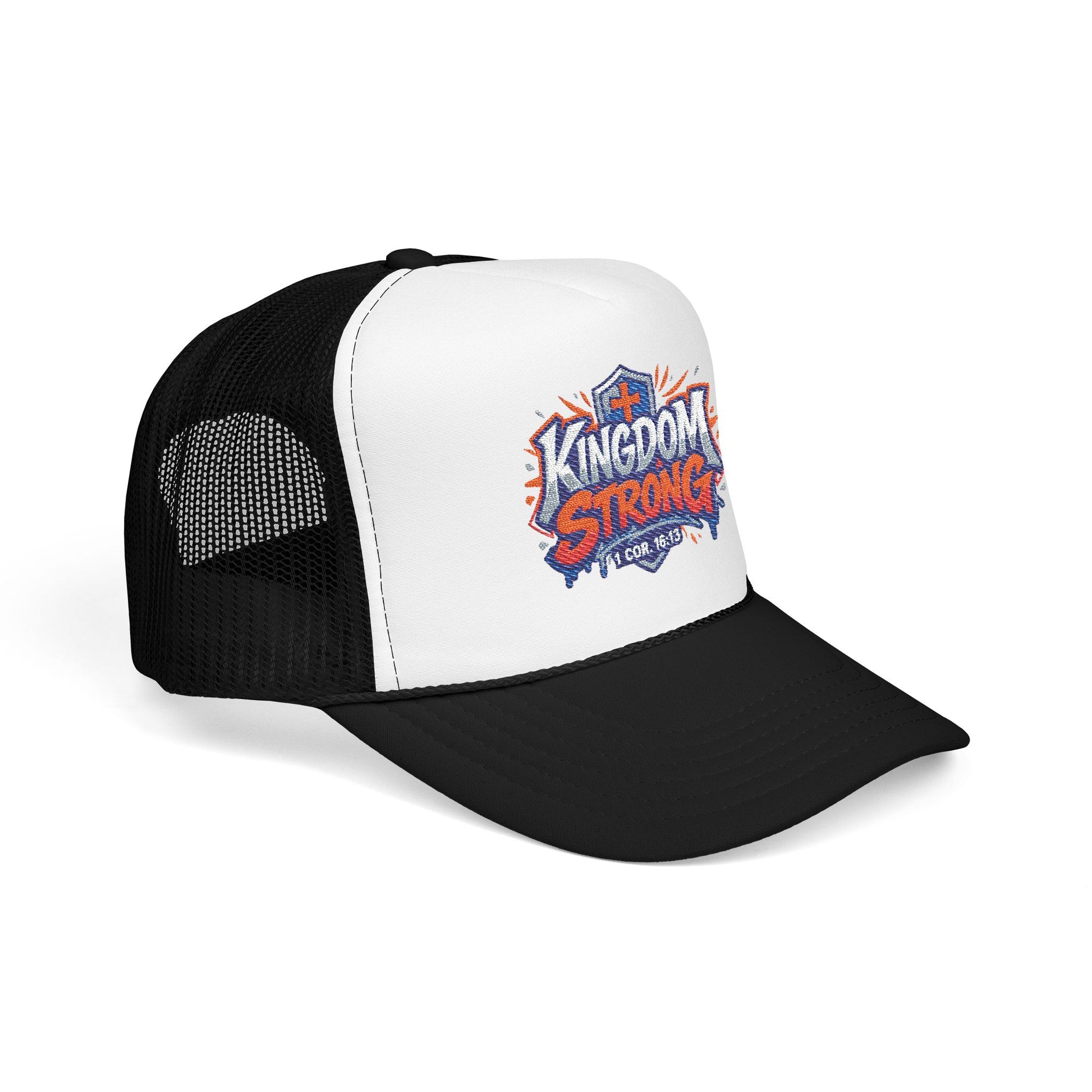 This structured foam trucker merges street-ready attitude with bold embroidered detail. The high-profile, seamless foam front showcases the colorful "Kingdom Strong" patch with crisp stitching and a matching fabric undervisor, while the ventilated mesh back keeps you cool during long days outdoors. Durable polyester and reinforced stitching give the cap a substantial, long-lasting feel — the kind that holds its shape through wear and washes. The adjustable snap lets you dial in a comfortable fit, and the lined front panel keeps the embroidery looking sharp. Wear it to rally a crowd, lead a service project, or simply add confident color to everyday outfits.